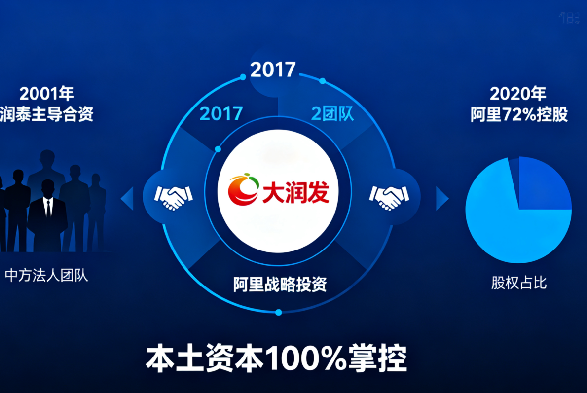 2017 年阿里巴巴战略投资后,于 2020 年以72% 持股实现控股,两大股东润泰与阿里均为中国资本,彻底奠定本土资本主导格局。