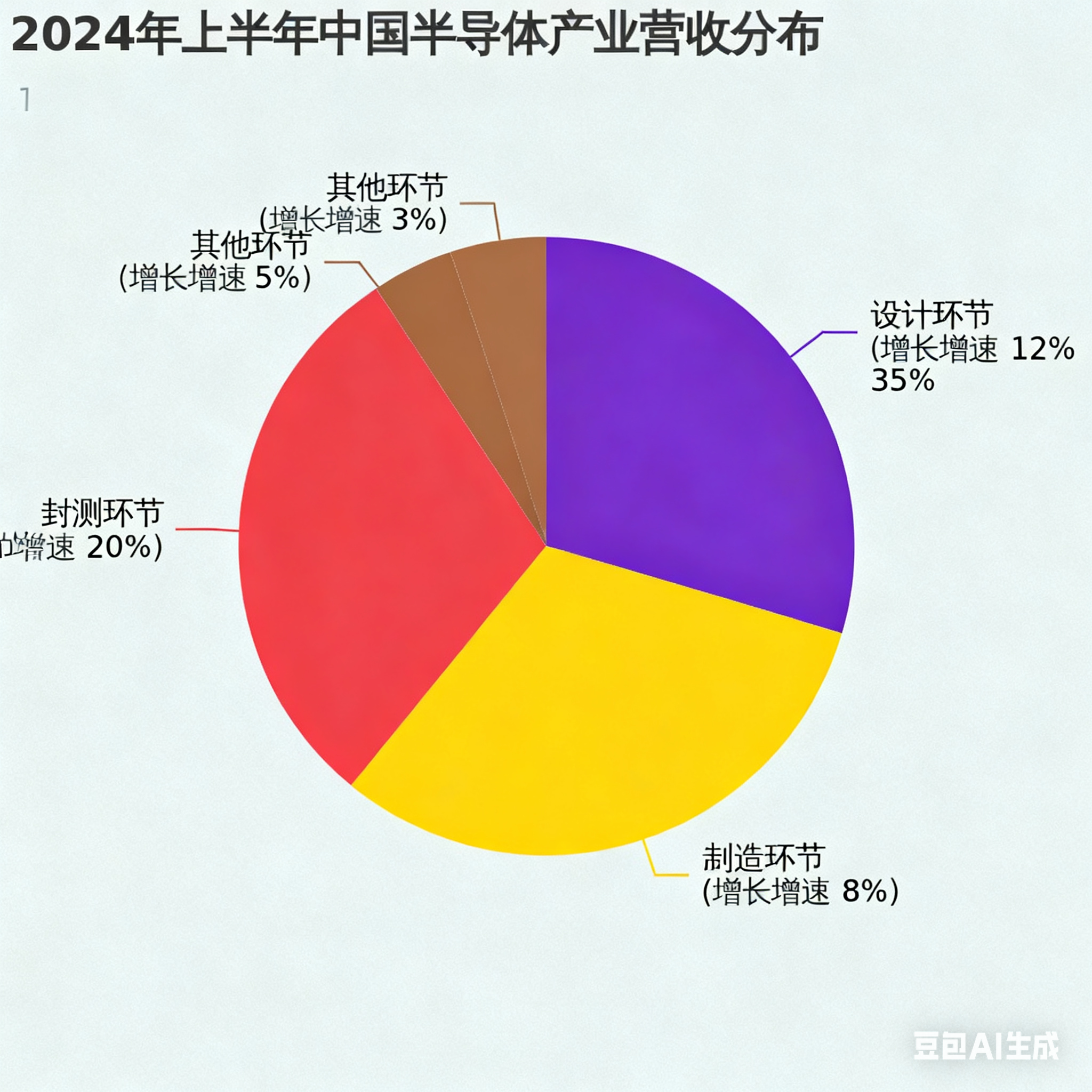 其中,集成电路设计业表现尤为突出:上半年营收达 **3092 亿元**,占产业总营收比重超 42%,同比增长 15.6%,成为拉动产业增长的核心动力;制造环节营收 1987 亿元,同比增长 6.8%,12 英寸先进制程产能利用率维持在 85% 以上;封测环节营收 2207 亿元,同比增长 4.3%,先进封装技术(如 Chiplet)渗透率突破 20%。