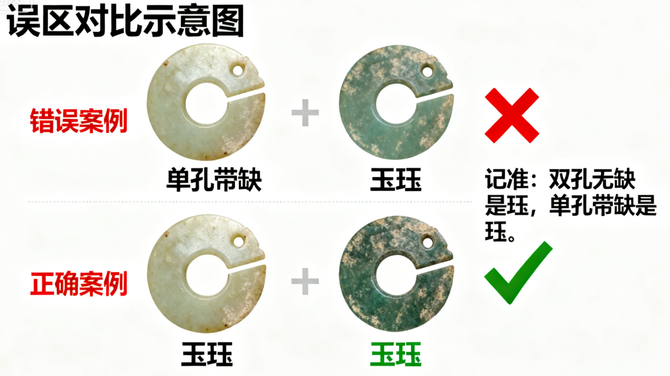错!玉玦也有孔,但关键在“缺口”——哪怕只有一个小孔,只要边缘有缺,就是玉玦;反之,双孔无缺的才是玉珏。 - 误区2:“玉玦是残次品”