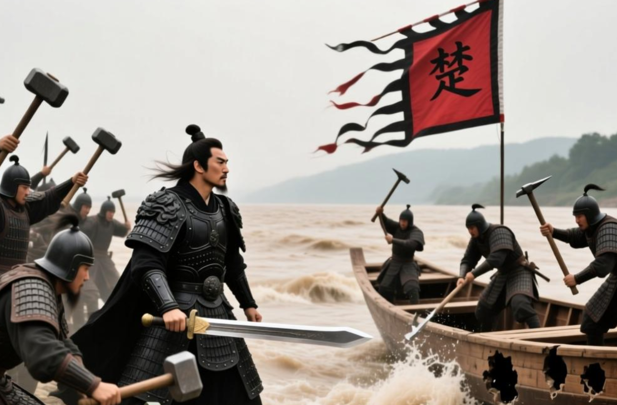 这个典故发生在公元前207年的“巨鹿之战”,当时项羽率领楚军救援被秦军围困的赵国,为了激发士兵斗志、断绝退路,他下令砸掉做饭的锅(“破釜”)、凿沉渡河的船(“沉舟”),最终以少胜多,击败了十倍于己的秦军,成为秦末战争的“转折点”。