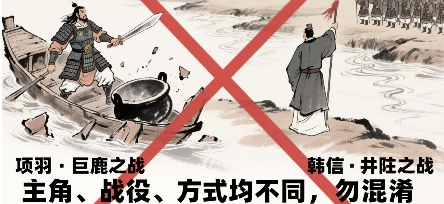 一句话记准:项羽“破釜沉舟”打巨鹿,韩信“背水一战”战井陉,前者“毁工具断退路”,后者“靠地形断退路”,主角和战役完全不同!