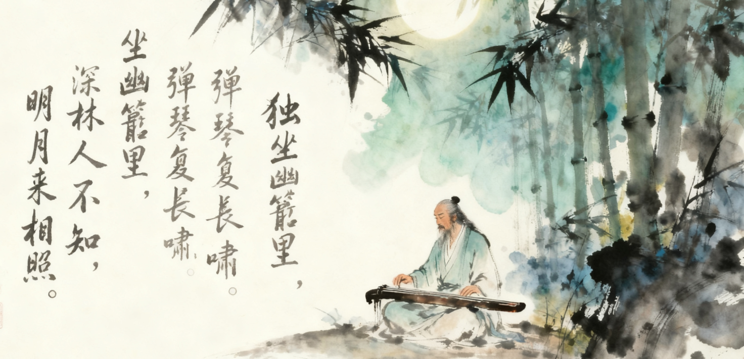整首诗读下来,没有华丽的辞藻,没有复杂的典故,甚至连景物描写都极简——只用“幽篁”“深林”“明月”三个词勾勒环境,用“独坐”“弹琴”“长啸”三个词刻画动作,却偏偏营造出一种“言有尽而意无穷”的境界。这种“淡而有味”的笔法,正是王维“诗中有画”的精髓:他不刻意“画”出月夜竹林的全貌,却让读者能透过寥寥数语,在脑海中勾勒出那幅清幽的“月夜弹琴图”;他不直接抒发情感,却让隐居生活的闲适、淡泊之志,顺着文字自然流淌出来。
